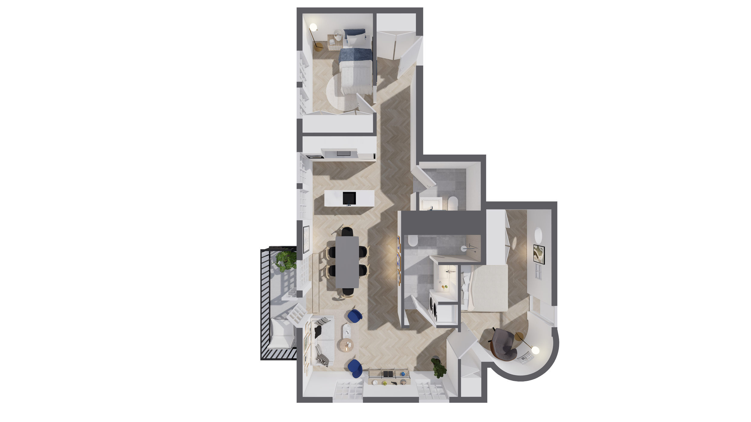 Lejligheden har en moderne planløsning med åbent køkkenalrum, som er hjertet i boligen og det naturlige opholdsrum.