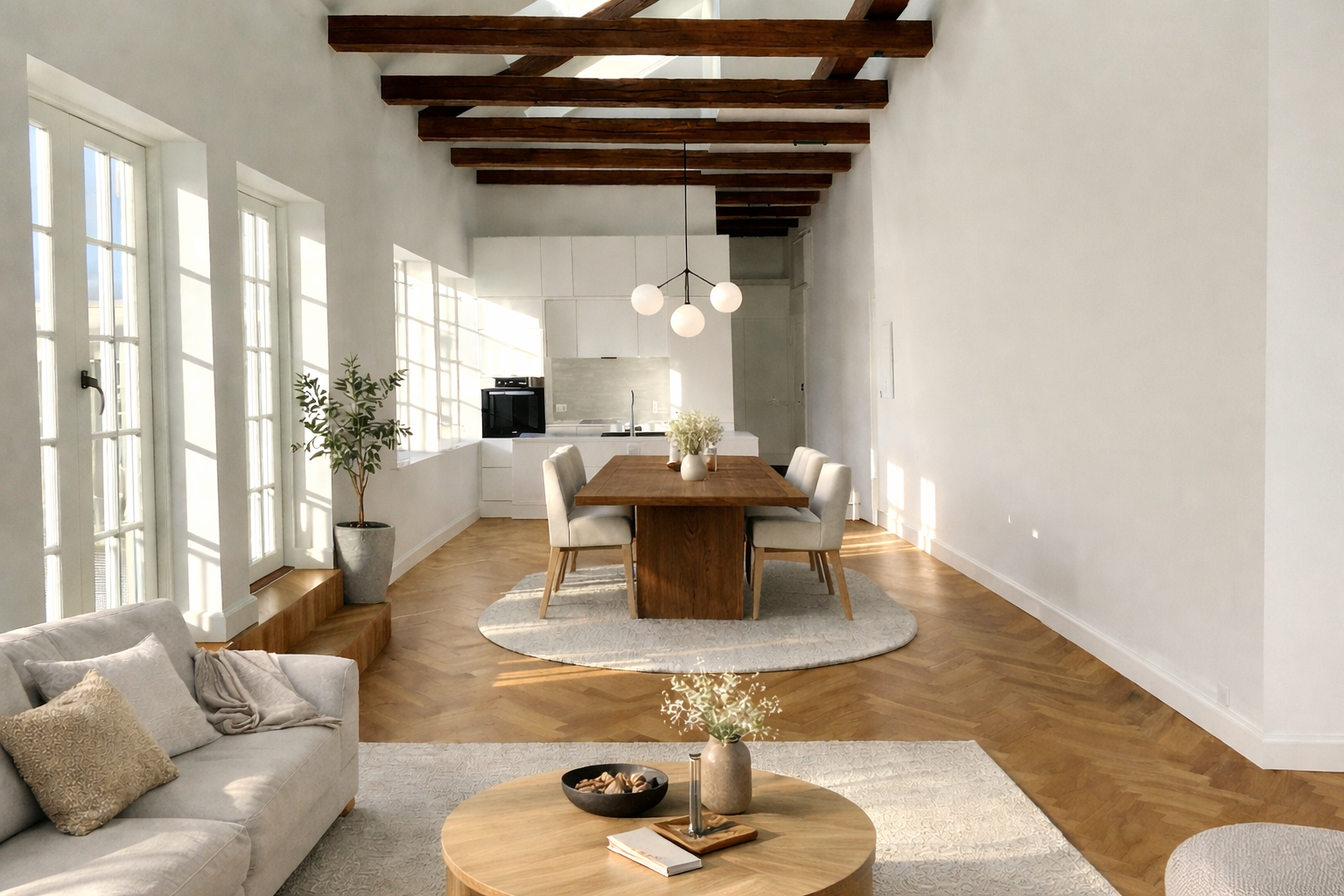 Lejligheden er totalrenoveret i eksklusive kvalitetsmaterialer, og gulvene, som er lagt i sildebensmønster i massivt egetræ, er udstyret med gulvvarme.