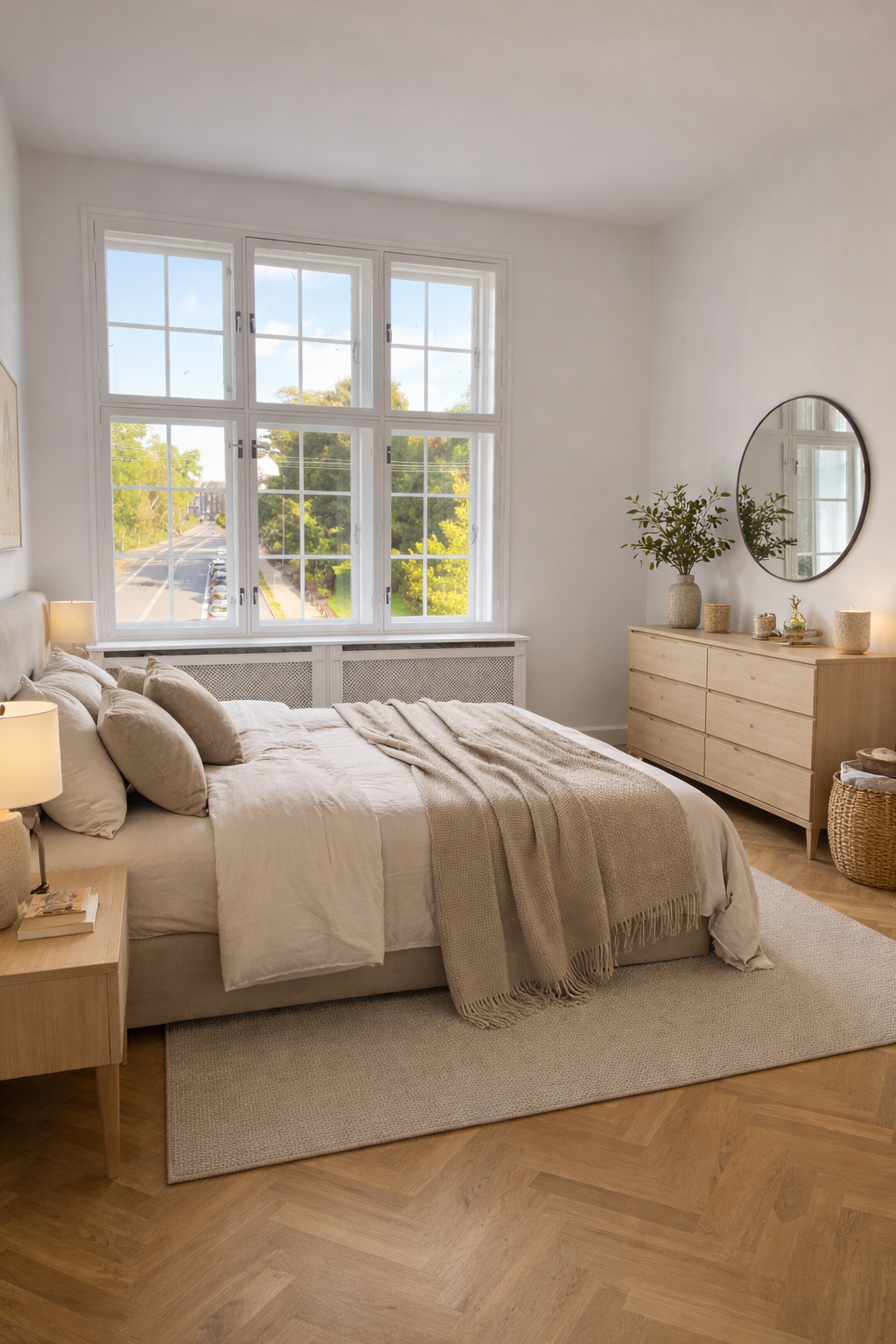 Lejligheden er smukt udført i kvalitetsmaterialer: Massive egetræsgulve i sildebensmønster med indlagt varme, køkken fra Svane og hvidevarer fra Miele. Badeværelset er udført i et enkelt, tidløst udtryk og indrammet med italienske klinker på vægge og gulve.