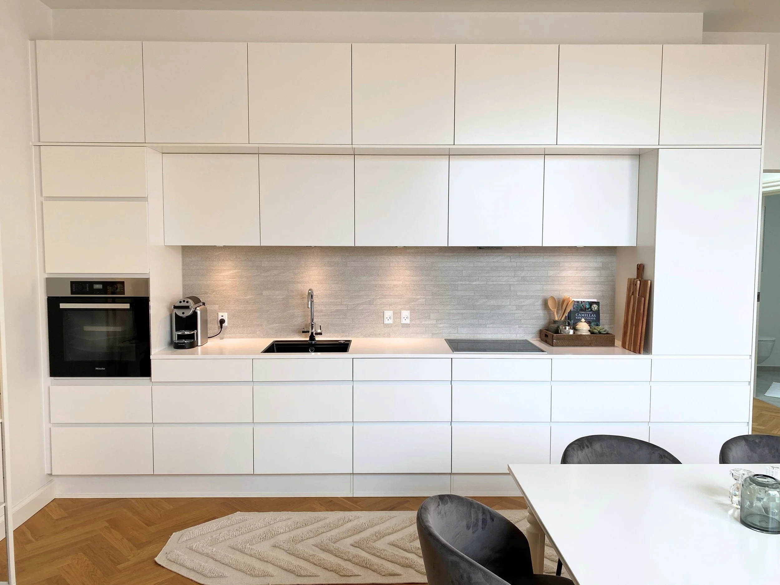 Køkkenet er et enkelt og elegant Svane-køkken med integrerede hårde hvidevarer, som alle er fra Miele (med undtagelse af Siemens opvaskemaskine og Thermex emhætte).