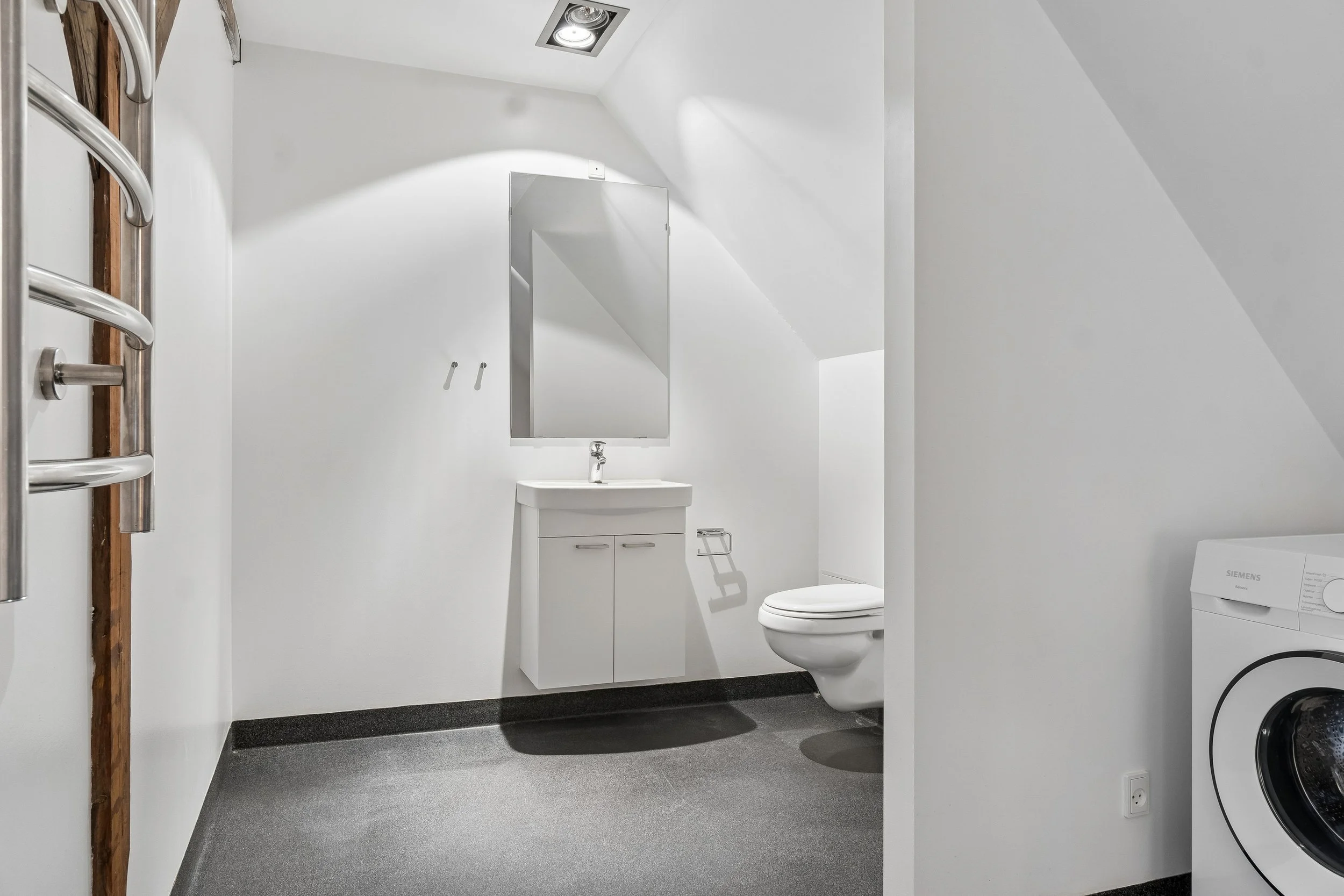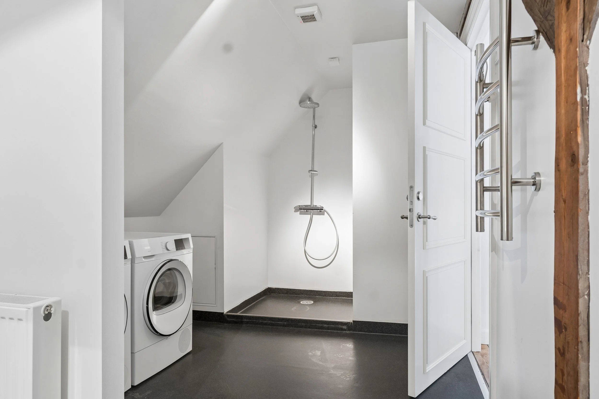 Badeværelset er rummeligt og har både vaskemaskine, tørretumbler, håndklædetørrer og god plads til opbevaring.