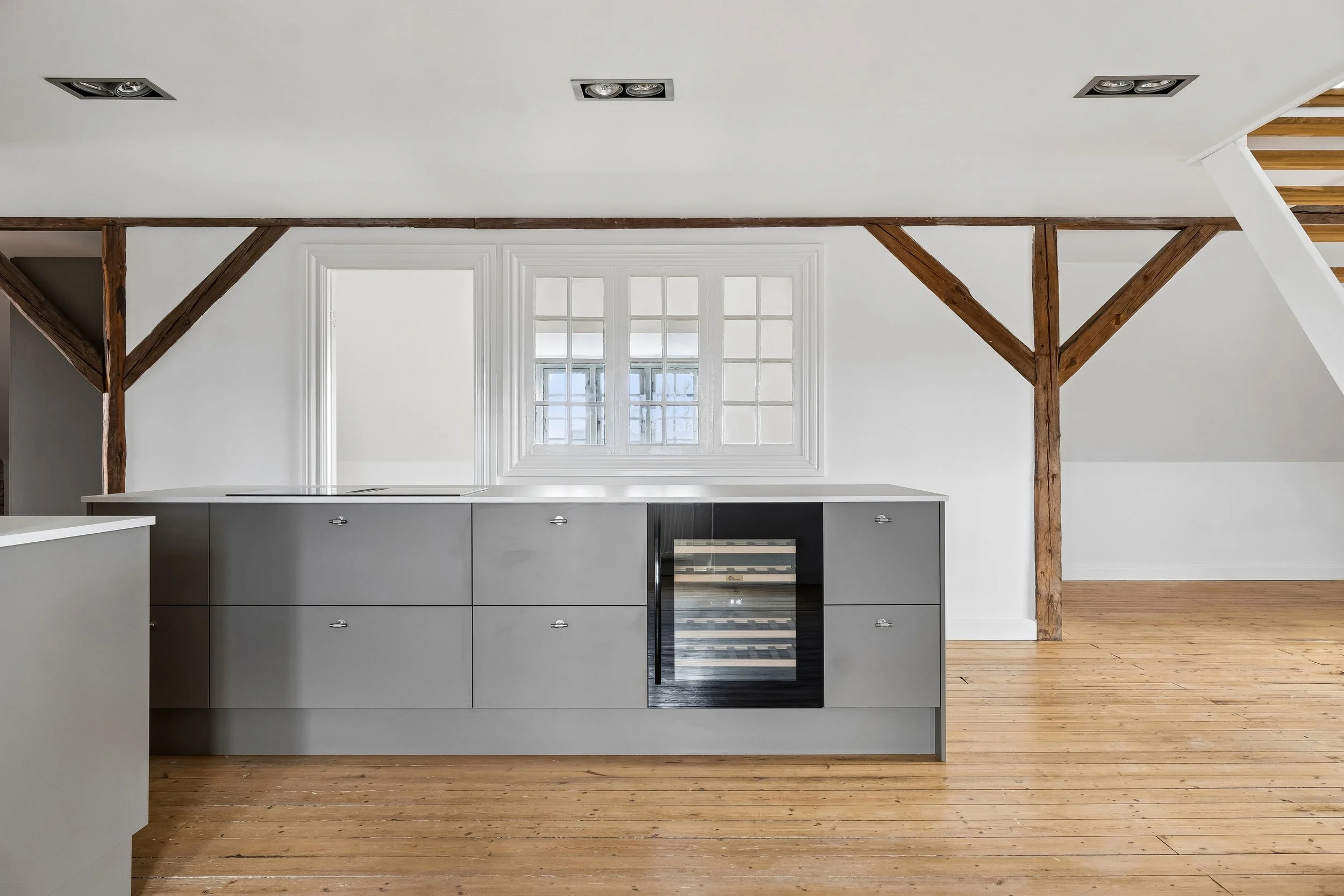 Lejlighedens naturlige samlingspunkt er det store køkken-alrum med nyt Svane-køkken og god plads til både hverdagsliv og gæster. Køkkenet er udstyret med opvaskemaskine, køle-/fryseskab, induktionskogeplade med indbygget emhætte, indbygningsovn og vinkøleskab.