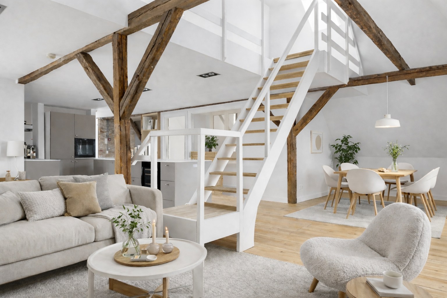 Boligen er på 188 m² med brede plankegulve, loft til kip og karaktergivende detaljer som synlige bjælker og rå murstensvæg.
